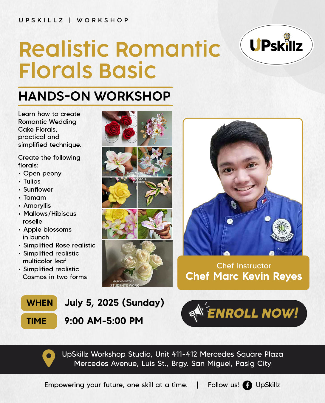 Rare chance to learn directly from, internationally recognized Chef Marc Kevin Reyes, sugar craft instructor, wedding cake master, and featured artist in global cake magazines — will teach his signature floral techniques in an exclusive face-to-face workshop.