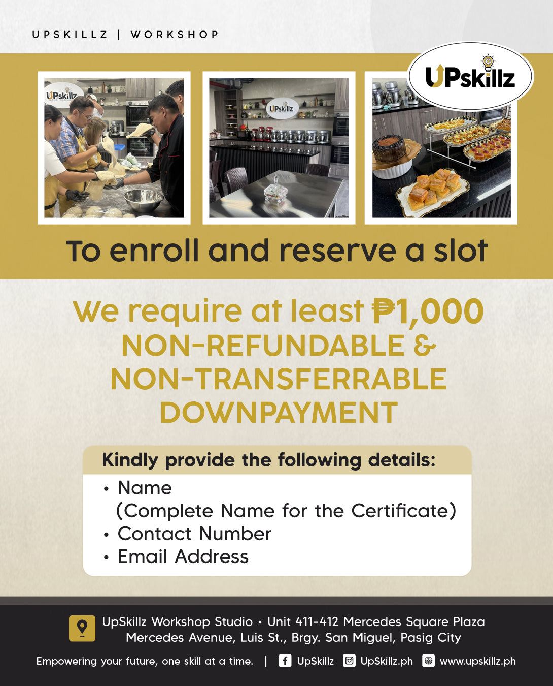 Pay the ₱1,000 reservation fee to secure your slot and Early Bird discount.