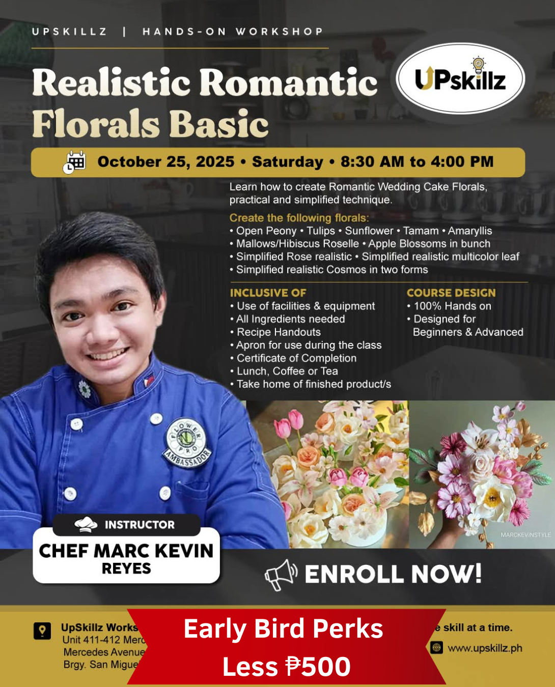 ✨ this is a Rare chance to learn directly from, internationally recognized Chef Marc Kevin Reyes, sugar craft instructor, wedding cake master, and featured artist in global cake magazines — will teach his signature floral techniques in an exclusive face-to-face workshop.